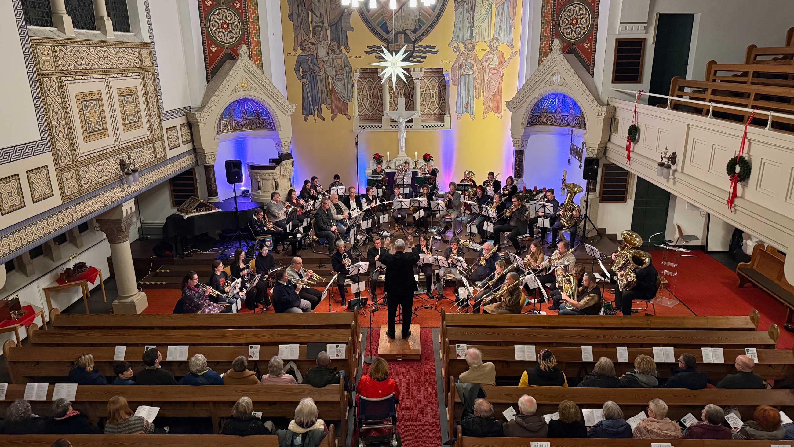 Doch nicht nur Zuhören war angesagt: Die Zuhörenden waren auch zum Mitmachen aufgerufen: Begleitet von Trompeten und Posaunen, Hörnern, Tuben und Euphonien wurden Advents- und Weihnachtslieder gesungen: