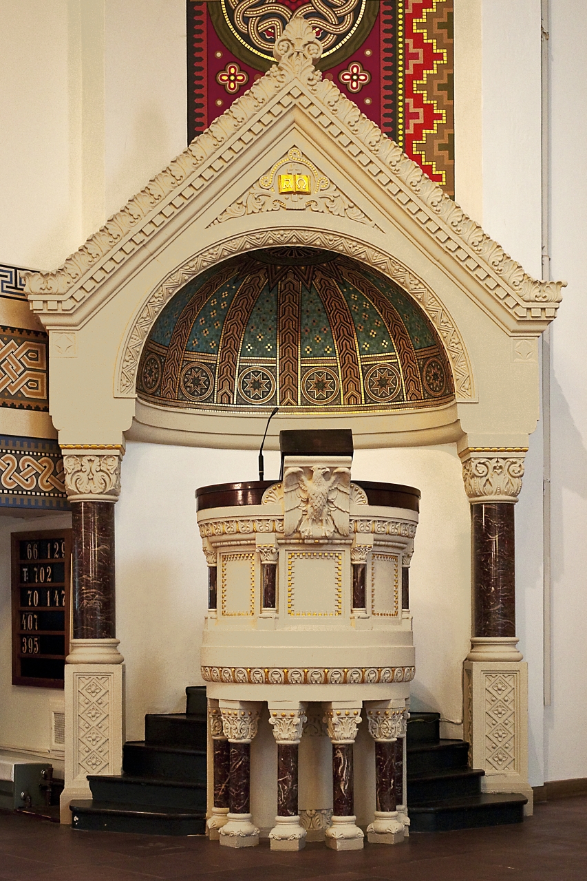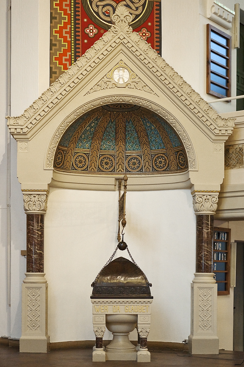 Links vom Altar steht die Kanzel, der Ort der Predigt. Rechts befindet sich der Taufstein mit Taufschale, die durch eine braune Messinghaube abgedeckt ist. Der Text auf dem Taufstein lautet: „Wer da glaubet und getauft wird, der wird selig werden.“ (Mk 16,16)