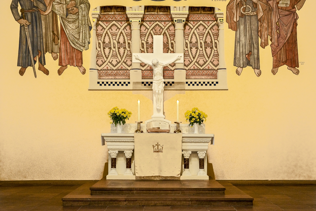 In der Mitte steht der Bankaltar, ein Tisch aus Stein, der zum Gottesdienst mit Blumen und Kerzen geschmückt ist. Das große Steinkreuz mit Kruzifix erinnert sichtbar an die Kreuzigung Jesu als Heilstat Gottes zur Versöhnung.