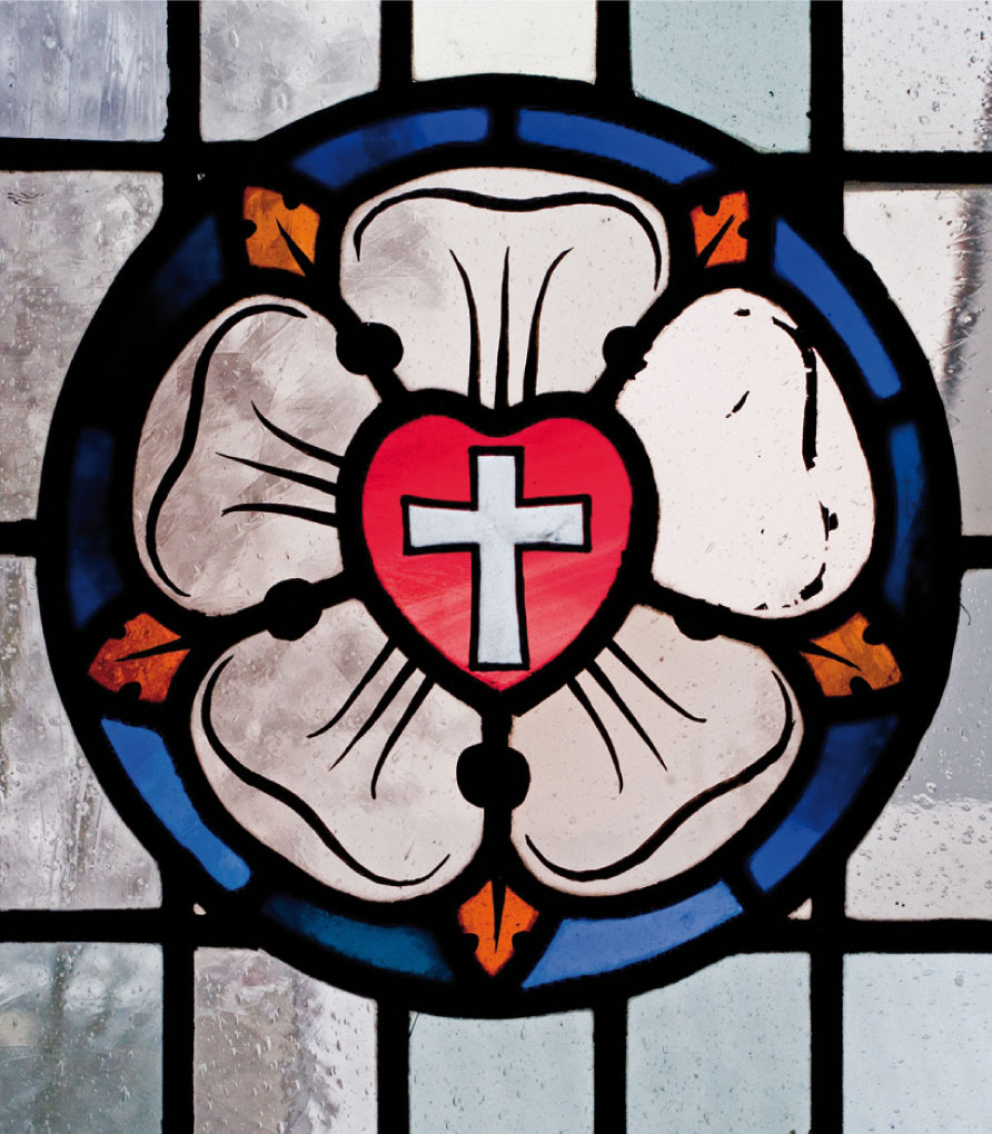 Die Lutherrose wurde von Martin Luther ab 1530 als Siegel auf seinen Schriften verwendet. Es ist eine weiße Rose, belegt mit einem roten Herzen, darin ein schwarzes Kreuz als ein Sinnbild für Kreuz und Leiden Jesu.