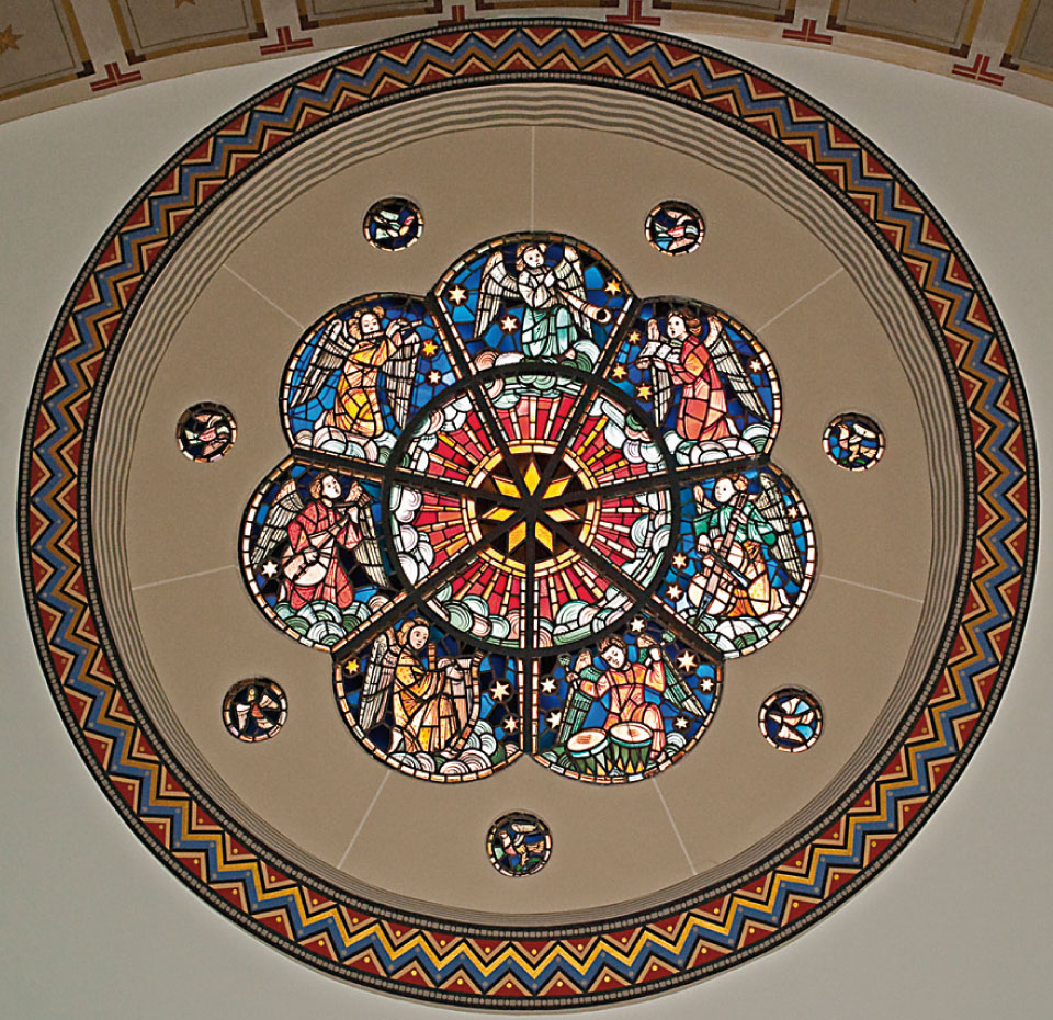 Der Glasentwurf des Rosettenfensters ist von 1955. In 7 Ausschnitten wird die Musica Sacra, der Chor der himmlischen Heerscharen zusammengefasst. Engel mit ihren Instrumenten weisen den Weg der Musik in Gottesdienst und Gemeindeleben.