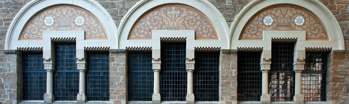 Der rote Bogen mit den 15 Rosetten-Motiven, der Apsisbogen, lenkt den Blick in den Altarraum und verbindet diesen mit dem Kirchenschiff.