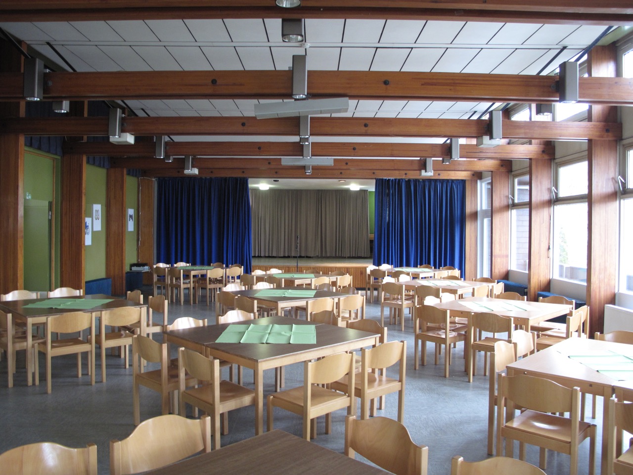 Auf der oberen Etage befinden sich 2 Säle, ein großer (56 Sitzplätze) mit Bühne und ein kleiner (40 Sitzplätze), die separat genutzt werden können, die aber auch zu einem ganz großen Saal zusammengelegt werden können. Außerdem ist hier die Küche zur Versorgung auch großer Veranstaltungen und ein weiterer Gruppenraum. Die obere Etage hat einen rollstuhlgerechten Zugang und ein entsprechendes WC.